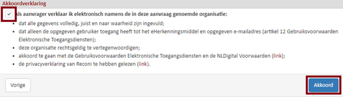 7. Controleer of alle gegevens juist zijn, en lees de voorwaarden a.u.b. door. Is alles correct? Vink de akkoordverklaring af, en kies vervolgens voor ‘Akkoord’: