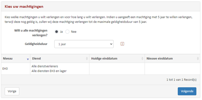 7. Kies de machtiging(en) die u wilt verlengen. Als u een machtiging voor alle diensten heeft, dan kunt u hier slechts één selectie maken. Heeft u bij uw eerste aanvraag gekozen voor specifieke machtigingen? Dan kunt u per machtiging kiezen of u deze wilt verlengen. Tevens kunt u voor een looptijd van 1, 3 of 5 jaar kiezen: