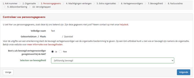 6. Uw persoonsgegevens worden getoond. Tevens kunt u selecteren of u een (van de) bevoegd vertegenwoordiger(s) bent. Dit is van belang voor één van de volgende stappen van het verlengingsproces: