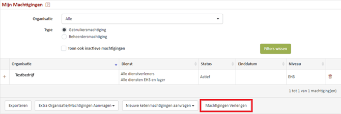 3. Er opent een nieuw scherm met hierin een overzicht van uw machtigingen. Onderaan het scherm kunt u kiezen voor ‘Machtigingen verlengen’ om de verlenging te starten: