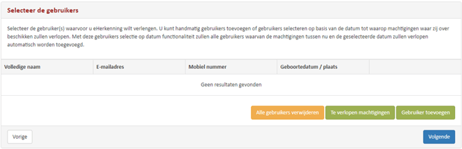 5. Klik op ‘gebruiker toevoegen’ om de gebruikers waarvan u het eHerkenningsmiddel wilt verlengen handmatig te kiezen. Wilt u alle machtigingen binnen uw organisatie verlengen die voor een bepaalde datum aflopen? Kies dan voor ‘Te verlopen machtigingen’ en vul daarna een datum in: